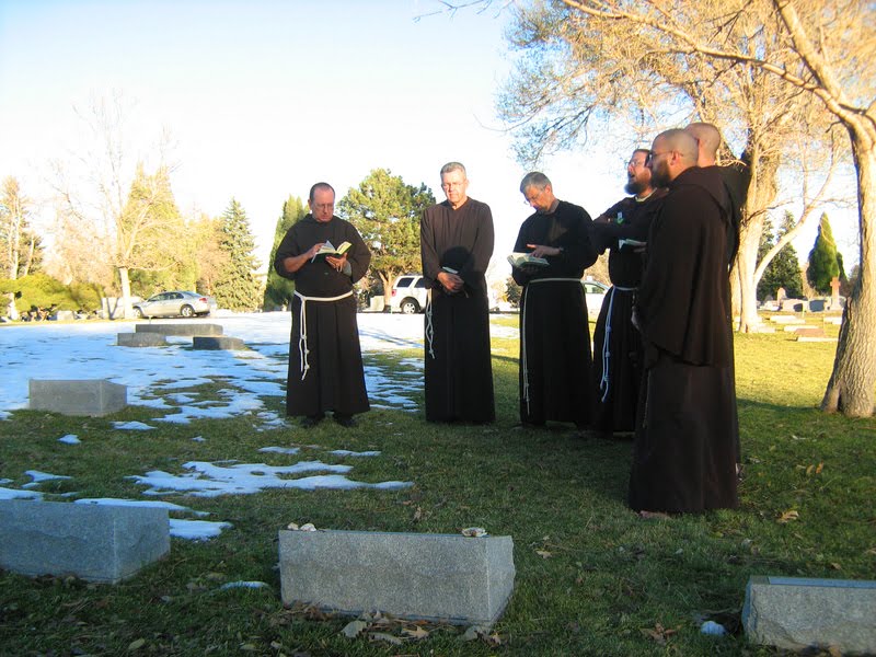 As has become a custom among the friars in Denver, and elsewhere, members of the Mid-America province visited Mt. Olivet Cemetery in Denver, Colorado on the eve of All Souls where they prayed evening prayer in honor of their deceased brothers and sisters. The Capuchin Friars and their Poor Clare sisters have a special plot where members of their Orders are laid to rest near other priests and religious of the diocese.